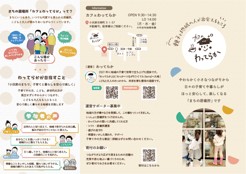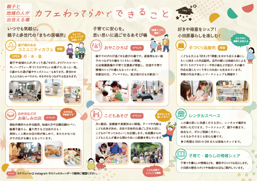 「小田原のまちで、子育てと暮らしを安心で楽しく」 子育て中の方、こども、多世代の方が 孤立せずにやわらかくつながり、 こどもも大人ももっともっと 安心で楽しく暮らせる地域を目指します